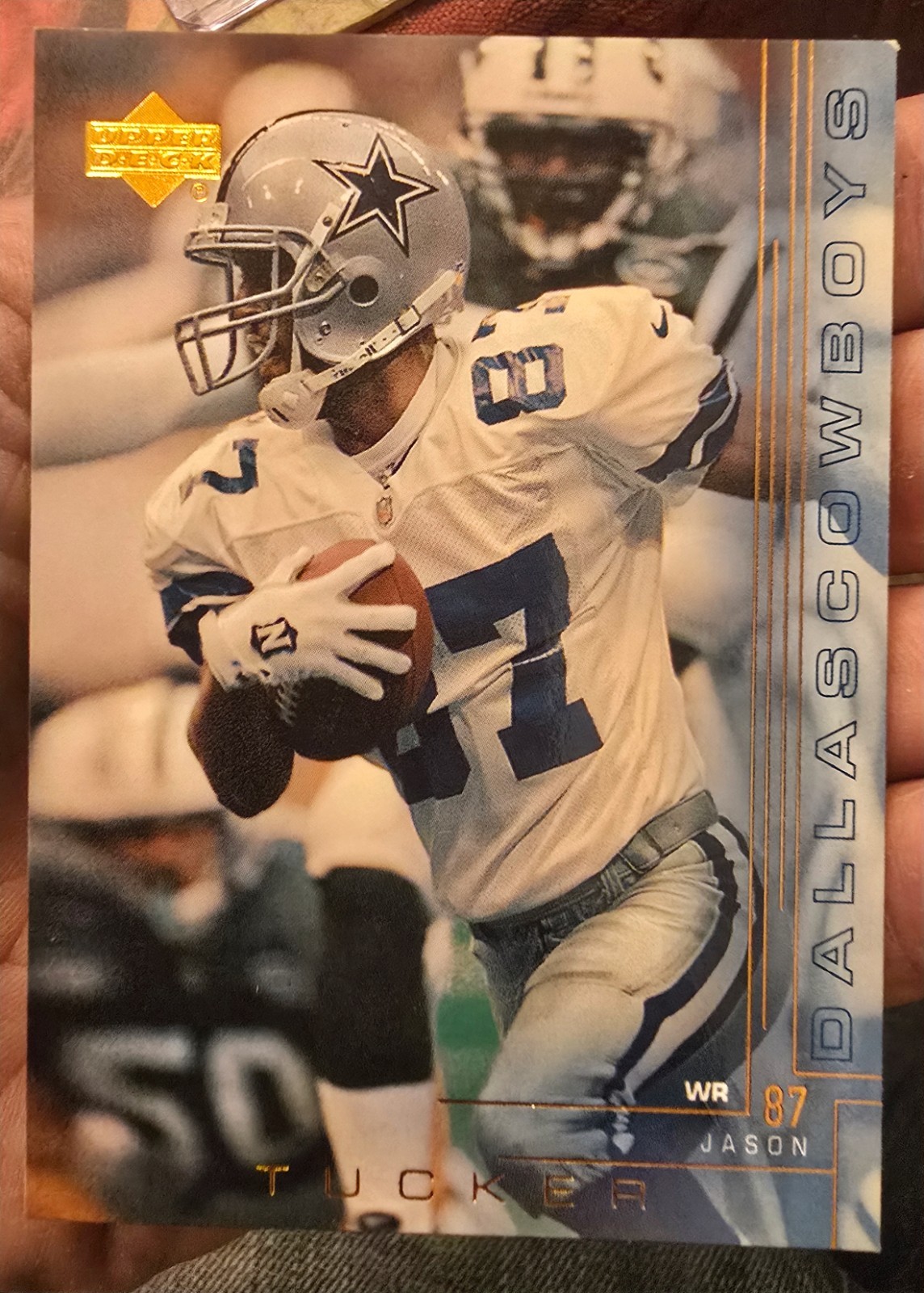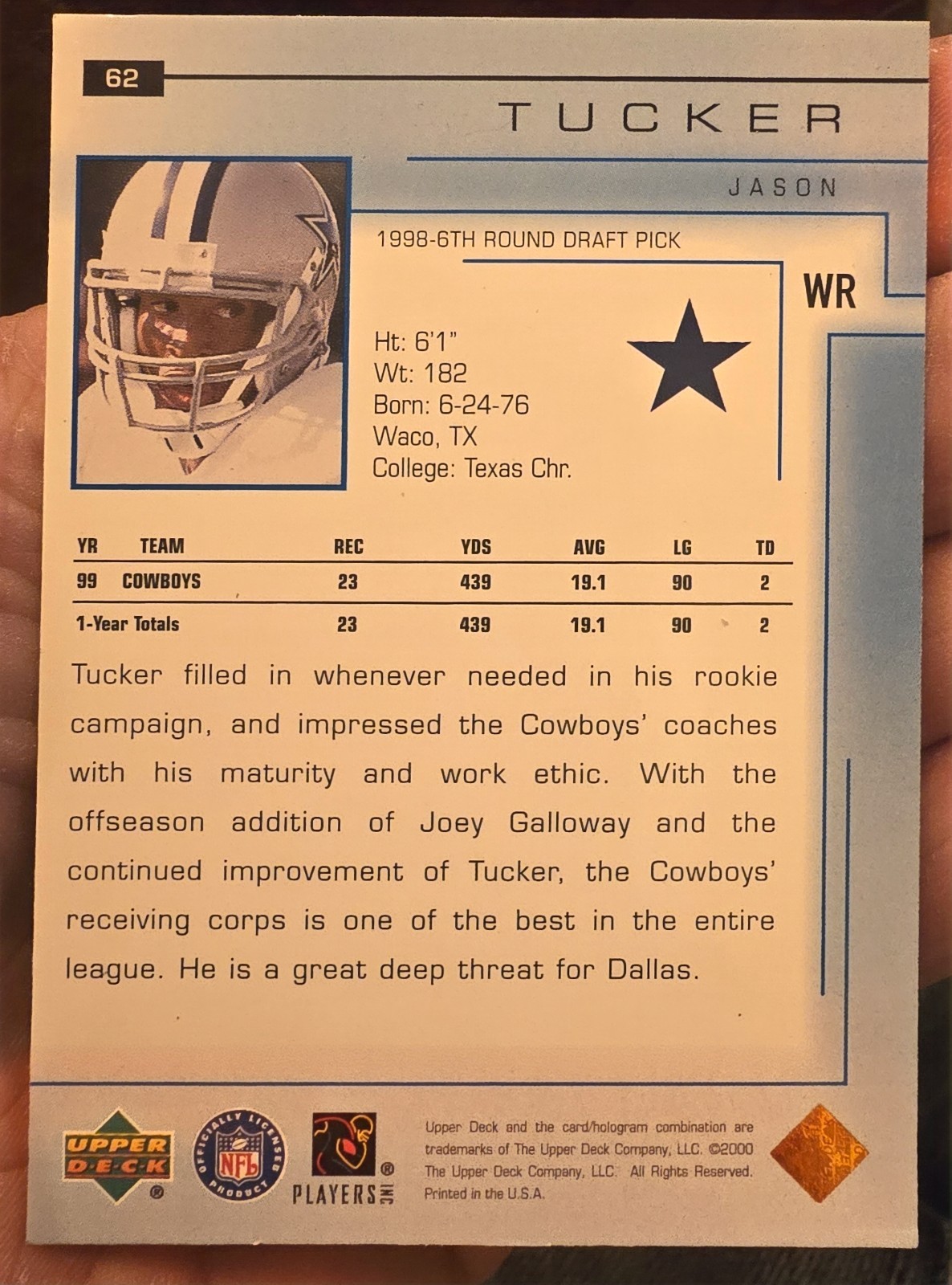 The product is a 2000 Upper Deck trading card featuring Jason Tucker from the Dallas Cowboys. This sports trading card is part of the base set for that season and is ungraded. It is a valuable collectible for fans of the National Football League looking to add a piece of history to their collection.