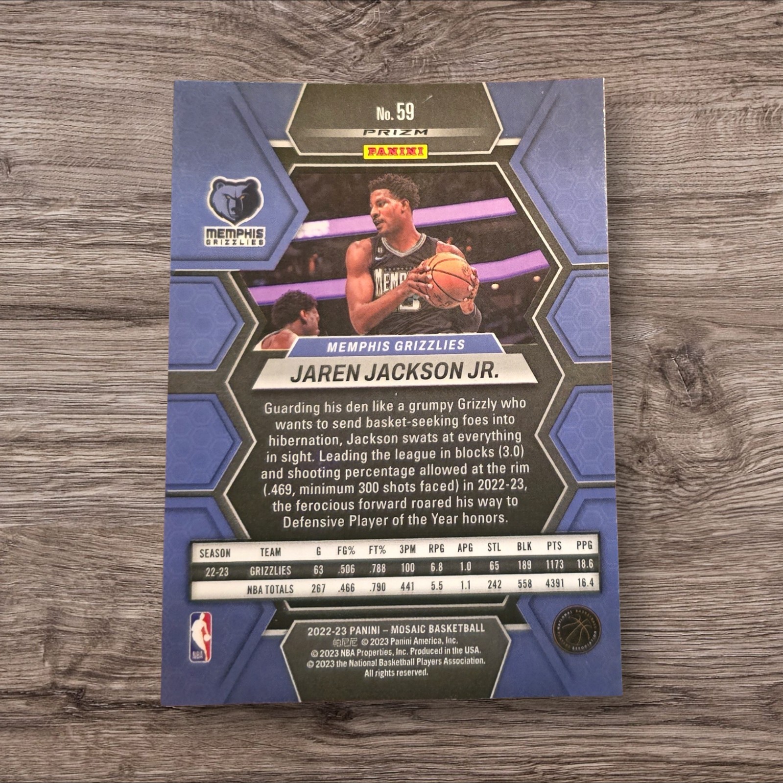 JUST PULLED!! The 2022-23 Panini Mosaic Jaren Jackson Jr. #59 Silver Prizm trading card is a highly sought-after sports collectible featuring the talented basketball player from the Memphis Grizzlies. This card is part of the Panini Mosaic set for the 2022-23 NBA season, showcasing a sleek Silver Prizm parallel variety that adds to its allure. With a focus on basketball and the excitement of the sport, this card is a must-have for fans and collectors alike who are looking to add a valuable piece to their collection.