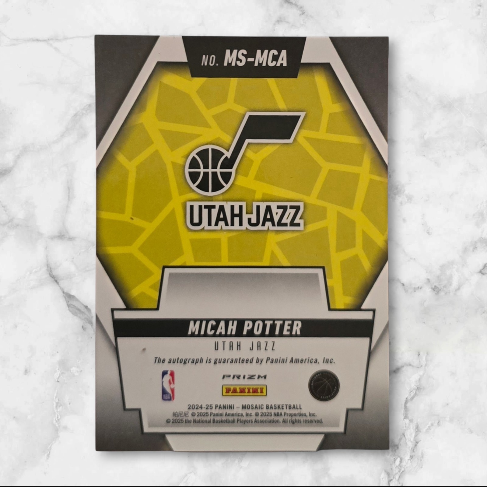 JUST PULLED!! The product is a 2024-25 Panini Mosaic trading card featuring Micah Potter of the Utah Jazz. This card is part of the Scripts insert set and is designated as a rookie card. It is a basketball sports trading card and is ungraded in excellent condition. The card number is MS-MCA, and it is a base parallel variety. Made by Panini, this card is a valuable collectible for fans and collectors of the National Basketball Association (NBA).