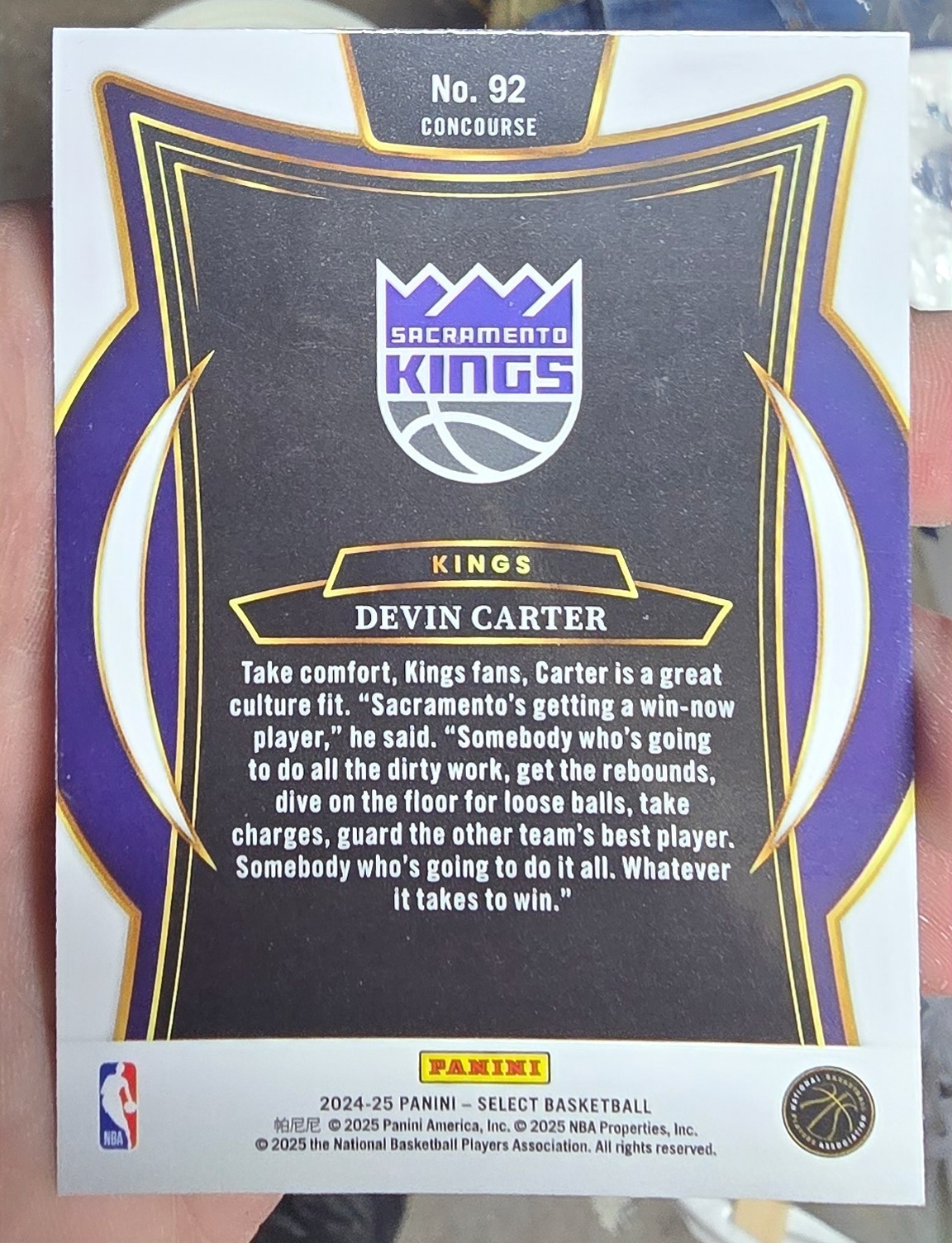 The product is a 2024-25 Panini Select basketball trading card featuring Devin Carter of the Sacramento Kings. This particular card is a Blue Prizm parallel variety from the Concourse set. As a rookie card with the number 92, it is a valuable collectible for fans and collectors of NBA trading cards. The card is in near mint condition or better and is a sought-after item within the sports trading card market.