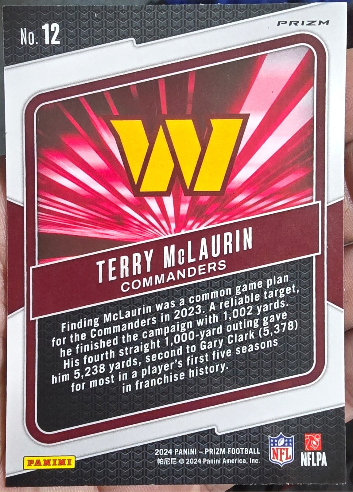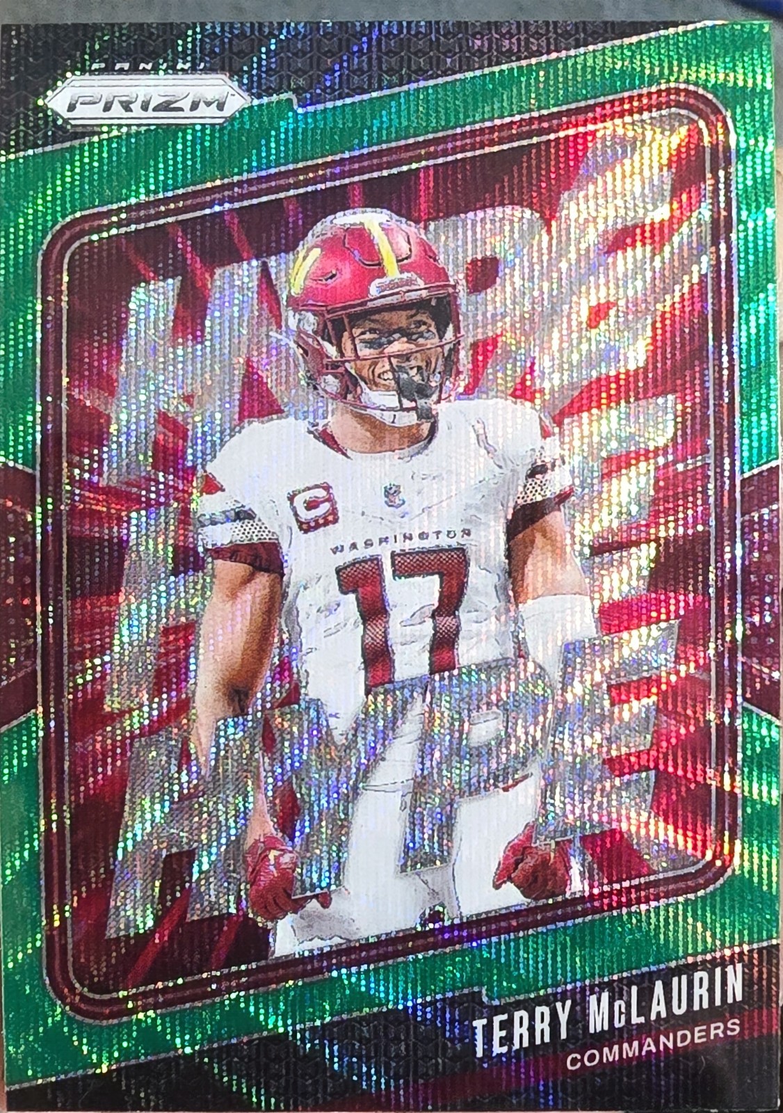The product is a 2024 Panini Prizm trading card featuring Terry McLaurin from the Washington Commanders in the National Football League (NFL). This particular card is from the Hype insert set and is a Green Wave Prizm parallel variety. It is numbered #12 and is described as near mint or better condition. As a highly collectible item, this sports trading card is a must-have for fans and collectors of football memorabilia.