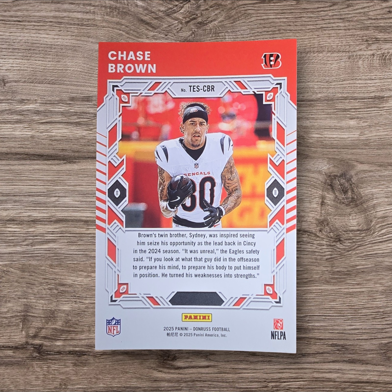 The 2025 Panini Donruss Football Elite Series Chase Brown #TES-CBR Bengals trading card is a standard-sized collectible featuring the talented player from the Cincinnati Bengals. Made of durable card stock with a 20 Pt. thickness, this original card is part of the 2025 Donruss set and is officially licensed by the National Football League (NFL). With its English language text and autograph authentication by Donruss, this card is a sought-after item for football fans and collectors alike. Perfect for showcasing at home or in a sports memorabilia collection, this card is a must-have for fans of Chase Brown and the Bengals.