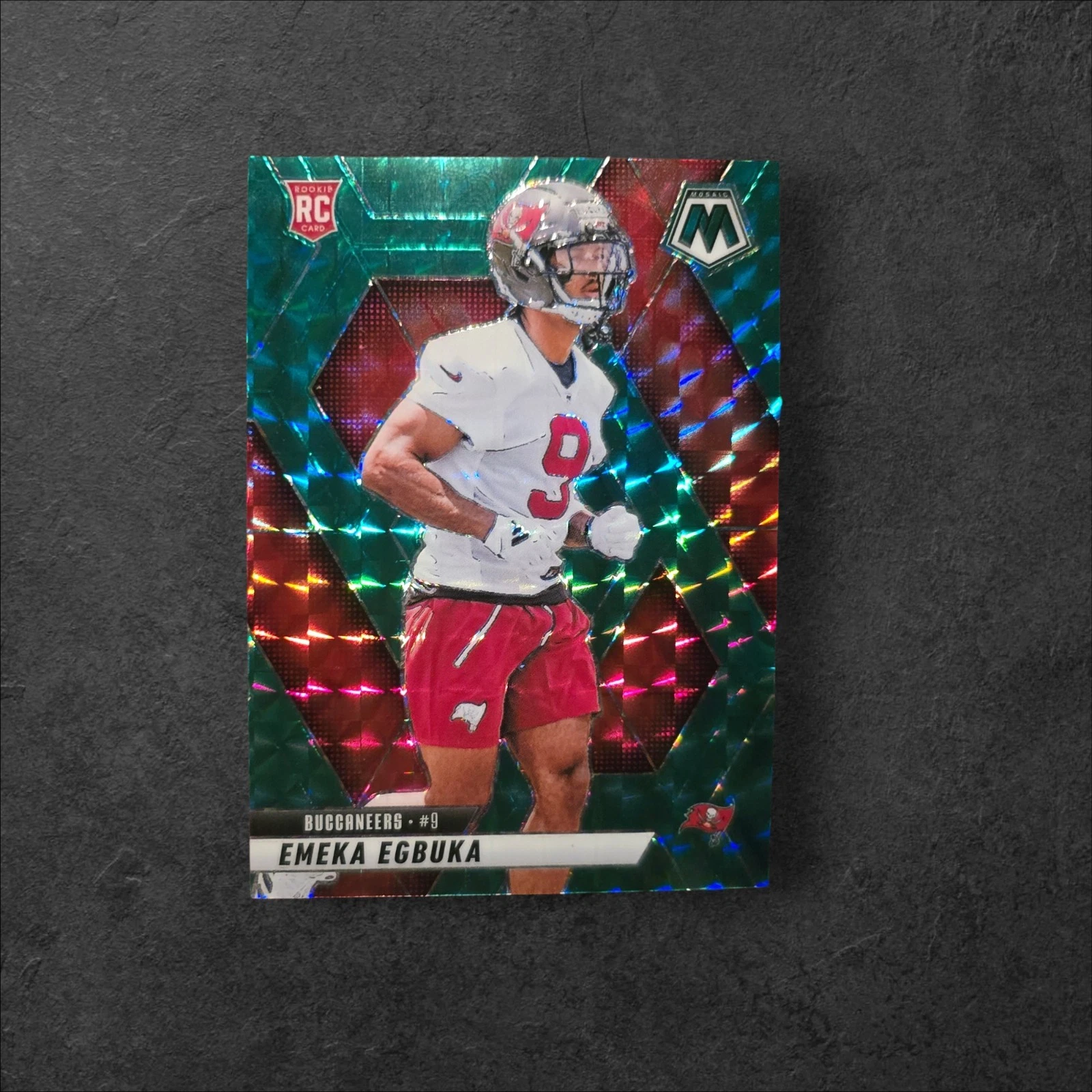 PULLED TODAY! The is a 2025 Panini Mosaic Emeka Egbuka Rookie Card featuring a Green Mosaic Prizm parallel. This standard-sized trading card is made of card stock with a 35 Pt. thickness, showcasing Emeka Egbuka from the Tampa Bay Buccaneers in the National Football League. It is an original release by Panini, un-autographed and in near mint or better condition. As a rookie card from the 2025 season, this collectible is perfect for fans and collectors looking to add a piece of the player’s early career to their collection.